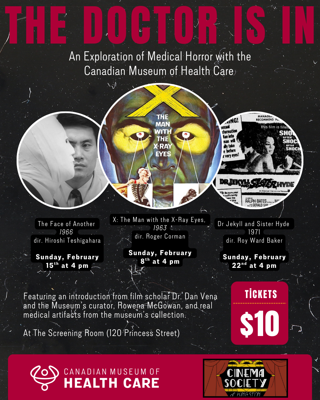 The Canadian Museum of Health Care is going to the movies! Each Sunday from February 8th to the 22nd, we’ll be showing a medical horror film at the Screening Room in partnership with The Cinema Society of Kingston. Each film will begin with an introduction from our curator, Rowena McGowan, and film scholar Dr. Dan Vena, exploring how and why real medicine is transformed into medical horror.