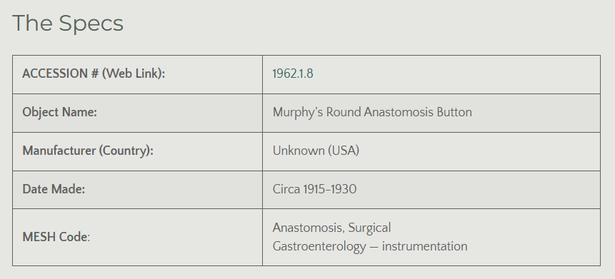 In 1892 Dr. Murphy devised a tool that, in his estimation, was “going to revolutionize intestinal surgery,” and the treatment of cholecystic disease. Developed in an animal laboratory in his backyard (and used on a human only six days after first being tested on a dog!), Murphy’s button was designed to join hollow viscera, specifically the gallbladder to the intestine, without the use of sutures. The spherical device splits in two, the tissues are affixed each to one half with purse-string sutures, and the halves are snapped back together, holding the tissues together to heal. Murphy reported that his first cholecystoenterostomy took only 11 minutes, reducing operating time tenfold.