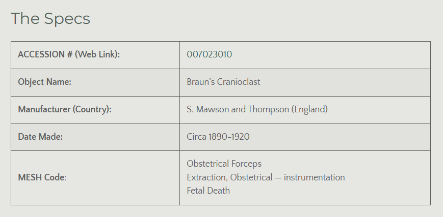 Prior to the 1900s, complicated births, particularly where there was a disproportion between the size of the woman’s pelvis and the foetus’ head, often meant the death of the baby and the mother. Instruments for removing a dead or ailing foetus from within the mother were used to attempt to save the mother’s life.
