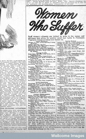 Stage, Sarah. Female Complaints: Lydia Pinkham and the Business of Women's Medicine New York: Norton Press, 1979.University of Toledo Libraries. “Patent Medicine.” Last updated January 3 2012, accessed June 8 2014, http://www.utoledo.edu/library/canaday/exhibits/quackery/quack3c.html