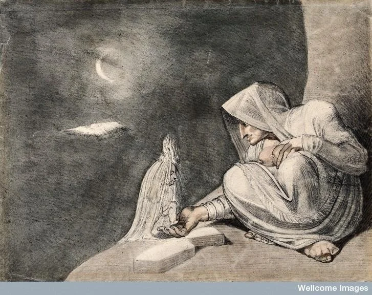 Interestingly, beliefs in the positive attributes of the Mandrake co-existed with sinister myths and connotations. Legends swirled in the Middle Ages that the plant did not reproduce through normal means, but instead sprung up on ground where either semen or blood had been spilt, particularly, underneath gallows. This idea surfaced in a 17th century French study of the plant written in Paris.[12] This theme also featured prominently in the work of English playwright John Webster (1578-1630), especially in his tragedy The White Devil. The conflicting, contradictory myths surrounding the mandrake in the 1600s are illustrated in Shakespeare’s use of mandrakes. The mandrake is a rather frequent trope in his work, surfacing in Othello, Antony and Cleopatra, Macbeth, Romeo and Juliet, and King Henry V1, and appeared alternatively as a curse, a charm, and a sedative. [13]