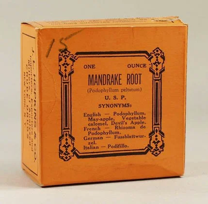 The mandrake’s use within 19th and early 20th century patent medicines seems to have escaped the notice of writers who have recently studied the mandrake’s history. Nevertheless, such a usage, or at least the advertising of products under the name of “mandrake,” appears to have been relatively widespread and longstanding. The Museum of Health Care’s collection has eight such artefacts, the earliest dating to the 1830s, and the latest dated object to 1915. Moreover, the eight objects are derived from seven different patent medicine producers, some of which, especially Parke-Davis, were amongst the largest pharmaceutical manufacturing companies of the era. All of the records pertaining to the artefacts indicate mandrake was advertised as an aid to stomach and digestive ailments, and was sold over-the-counter. Curiously, given the apparent popularity of the plant, or at least the use of the plant’s name to sell products, an article published in 1890 in the British Medical Journal makes no allusion to its use in patent medicines. In summarizing the plant’s use in ancient times, the lore surrounding it, and modern uses of the plant, the author mentions only contemporary work to create a wine from the mandrake and attempts to create anaesthetic and narcotic substances from its roots. [14]