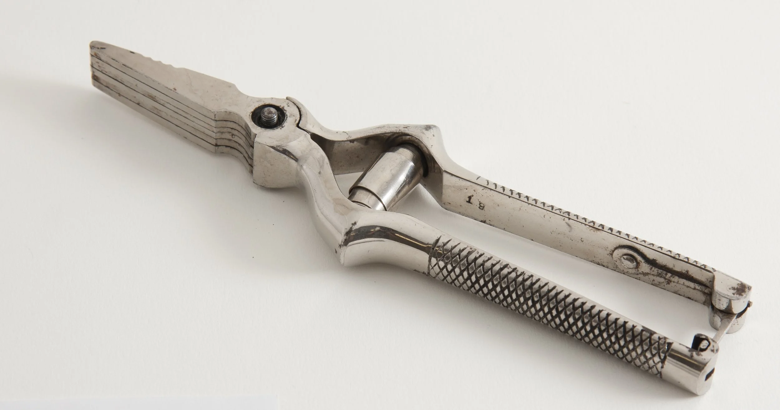 Enter the masticator! This tool was the superhero of the edentulous. The revolutionary masticator was used to pre-chew food for those who had lost their teeth or had teeth in very poor condition. With its spring loaded, scissor-like construction and sharp blades, the masticator made it easier for toothless people to enjoy the foods they loved. Imagine...sitting down to a delicious meal and alongside your knife and fork you have a masticator to pre-chew your steak and vegetables.