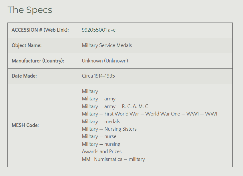 As a set of medals, those of Nursing Sister Ann Baillie are not unique, but are noteworthy – her ARRC and 1914-15 Star set her apart from many other Great War veterans whose medals are more likely to be the War Medal and the Victory Medal, possibly with a decoration for gallantry and/or leadership. Her Silver Jubilee Medal was probably awarded for her services to Nursing at the Kingston General Hospital.