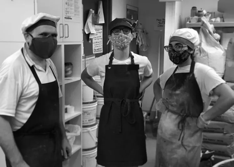 THEN (1): Men wearing masks during the Spanish Influenza epidemic, circa 1918. Library and Archives Canada. NOW (2): Bakery workers wearing non-medical masks during COVID-19 in Toronto, circa 2020. Photograph taken by the author.