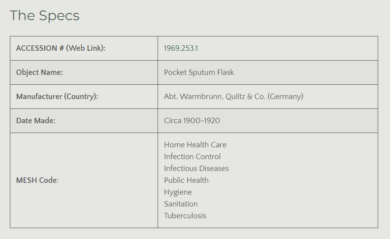 Tuberculosis patients were required to carry a pocket flask or cuspidor as an effective means to reduce the spread of the disease. The portable flask was used to collect sputum and when full, burning the contents was considered the safest method of disposal. This particular model is sometimes known as a Blue Henry, being of cobalt blue glass, but other models were of metal or disposable paper.