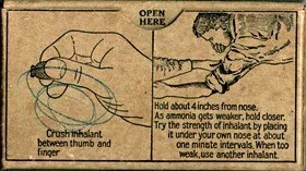 While the popularity and medical application of smelling salts diminishing in the 20th century due to advancements in modern medicine, they did become a common part of first aid kits during World War II; this lasted until the turn of the 21st century. These smelling salts typically took the form of a thin glass tube of ammonia with an outer layer of cotton and meshing; when the tube was crushed, the liquid was released onto the cotton, while the glass shards remained inside. This preparation ensured ease of use in emergency situations where quick revival was necessary.