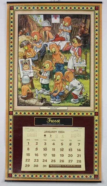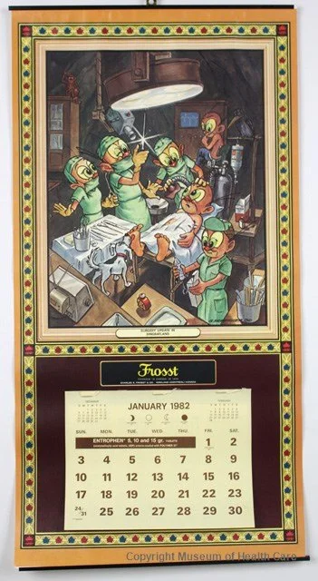 Remembered by so many for his Dingbats, Ward was also an accomplished artist outside of his work for Frosst-- he acted as an illustrator and cartoonist for the Illustrated London News, Ally Sloper, and Bystander in England, and the Courier, Canada Weekly, and Maclean's in Canada. He was also a member of the Society of Graphic Arts in Toronto, and his work went on exhibition with the Royal Canadian Academy of Arts, the Canadian National Exhibition, the Art Association of Montreal, and the Ontario Society of Artists from the 1910s through the 1930s. Today, in addition to the many Dingbat calendars in the collections of the Museum of Health Care, his works can be found in the National Gallery of Canada and the AGO - Art Gallery of Ontario.
