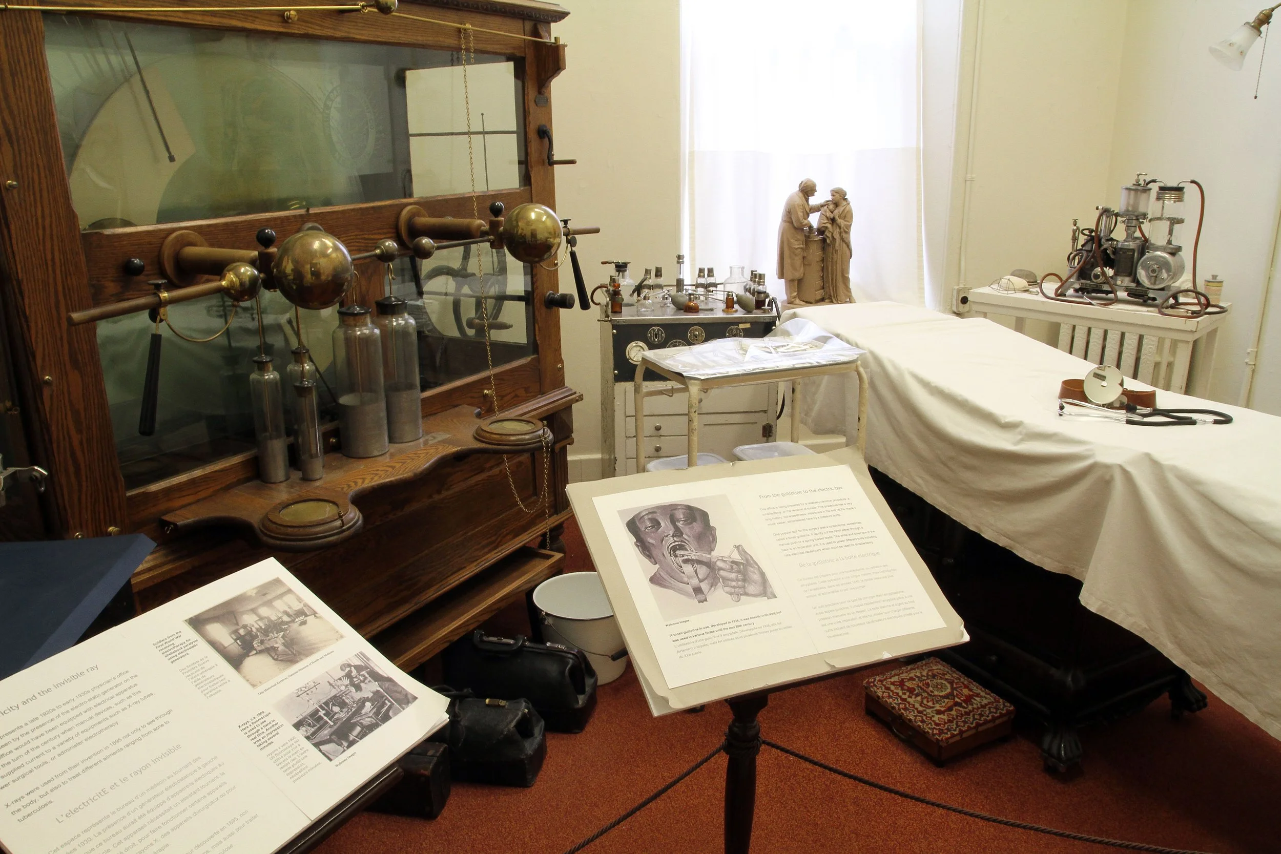 Step into a 1930s-era doctor’s treatment room, modeled after the practice of Dr. Charles Bird and his son Dr. Godfrey Bird in Gananoque, Ontario. This immersive exhibit explores the everyday world of general medical practice in early 20th‑century Canada—including the emergence of electricity and X‑ray technology as transformative forces in diagnosis and treatment. A centerpiece of the display is a rare early‑1900s electrostatic generator, used for pioneering therapies and imaging demonstrations in the era's emerging electrotherapy practices.